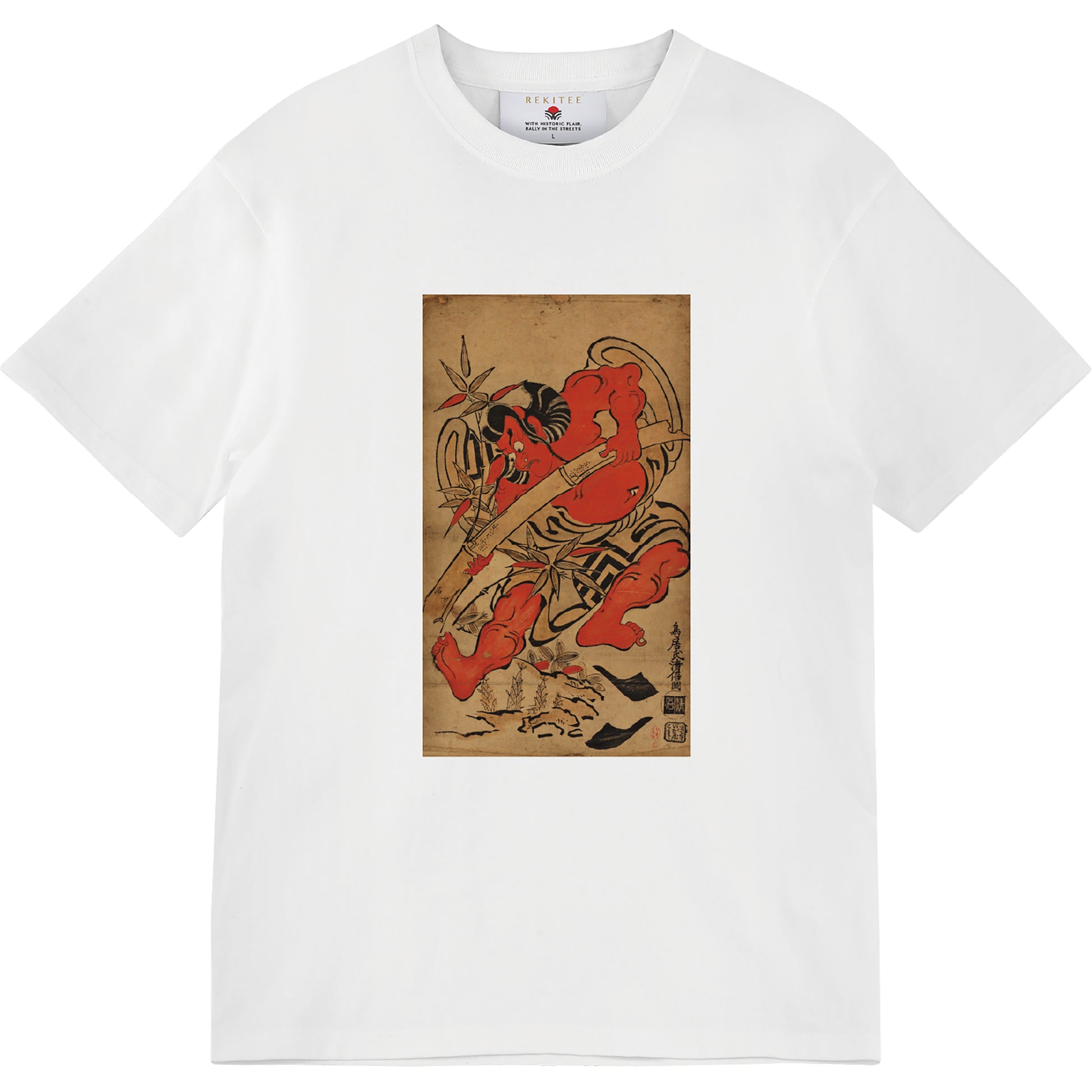This ukiyo-e depicts Ichikawa Danjuro I performing kabuki in 1697. The portrayal is highly stylized to emphasize the character's dramatic presence, employing techniques such as exaggerated musculature in the limbs, legs tapered into gourd-like shapes, and bold, dynamic brushstrokes that convey a sense of movement.