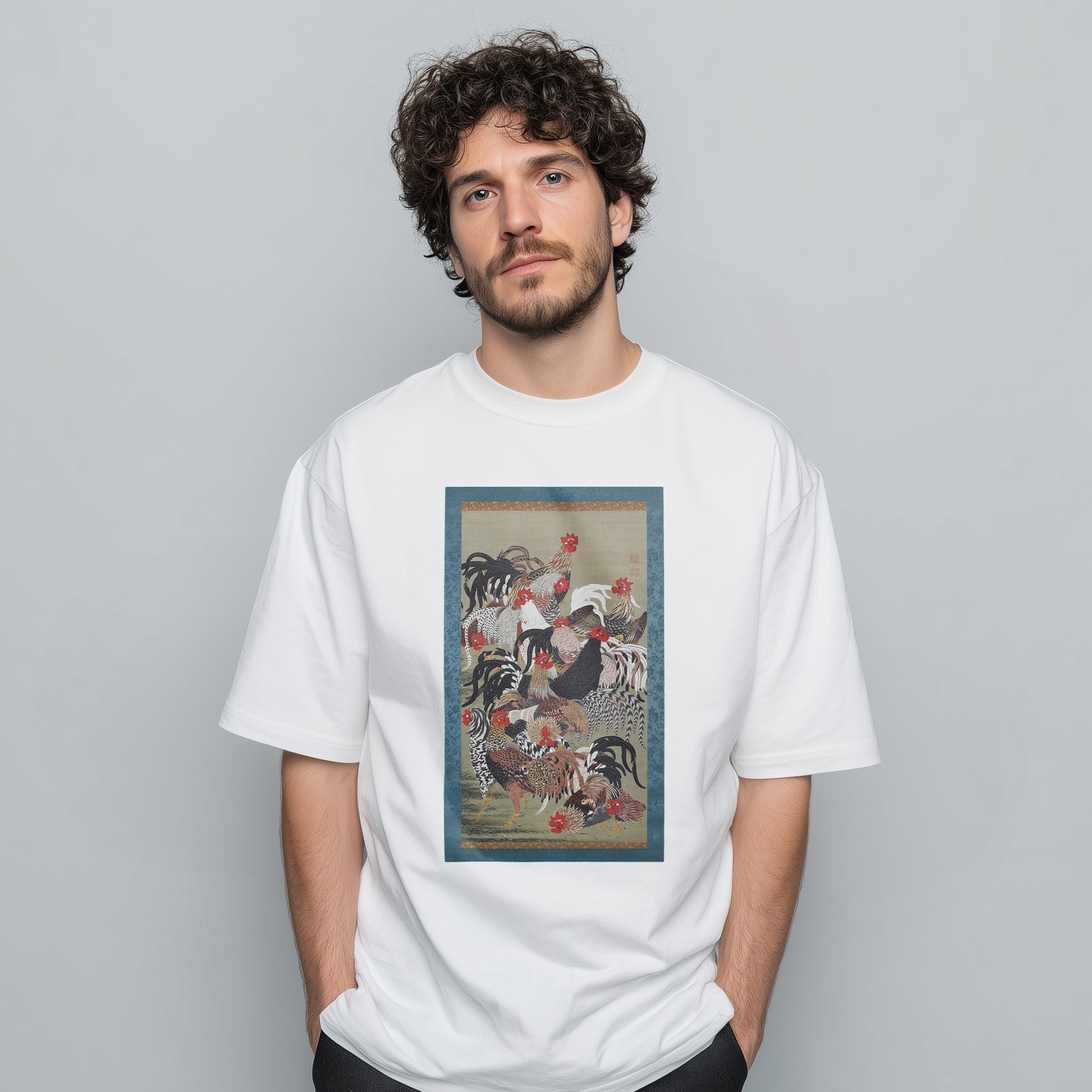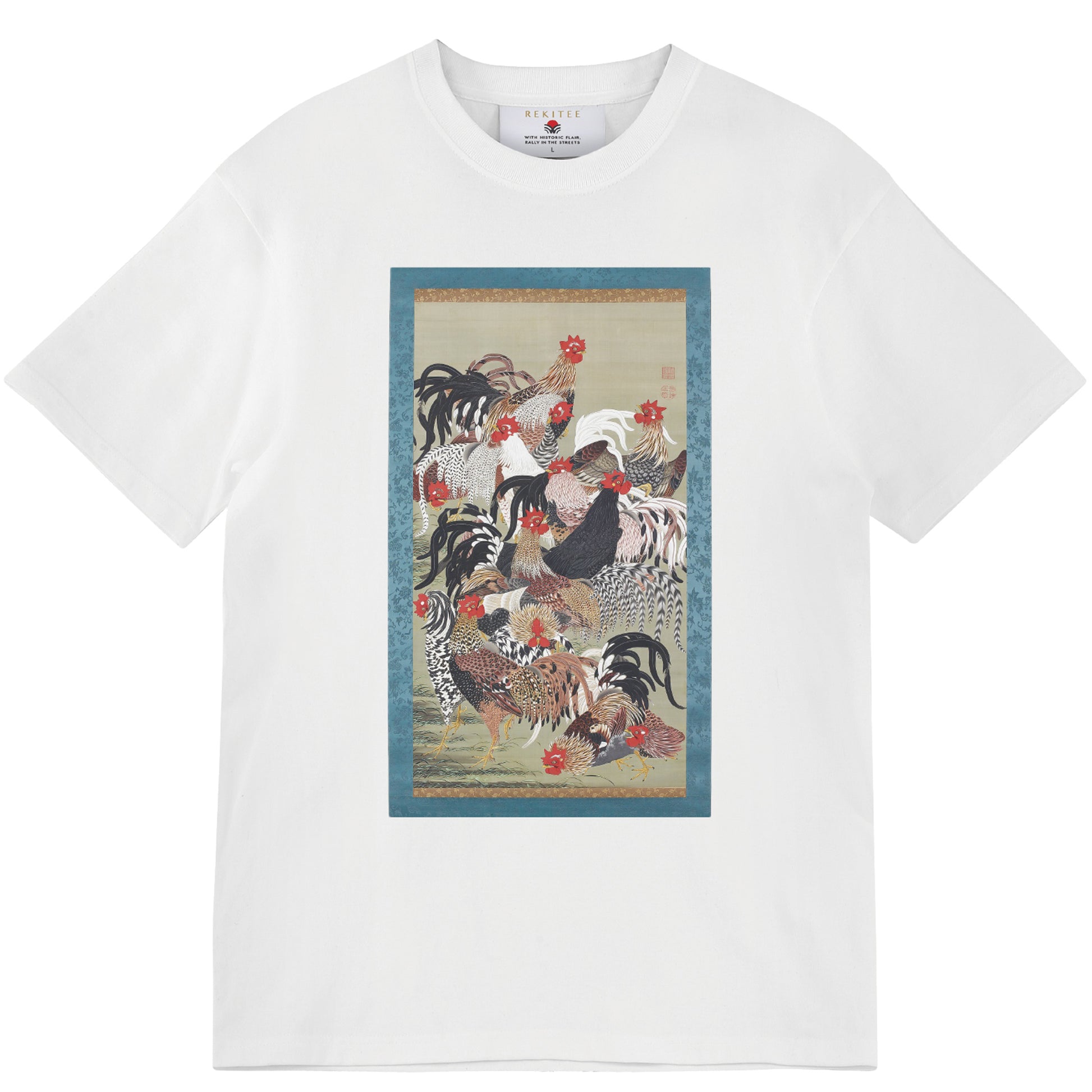 This polychrome painting depicts thirteen roosters rendered vividly in a variety of dynamic poses. The extraordinary precision of the composition overwhelms the viewer. The feathers of all the birds overlap so completely that it becomes impossible to distinguish which rooster they belong to.