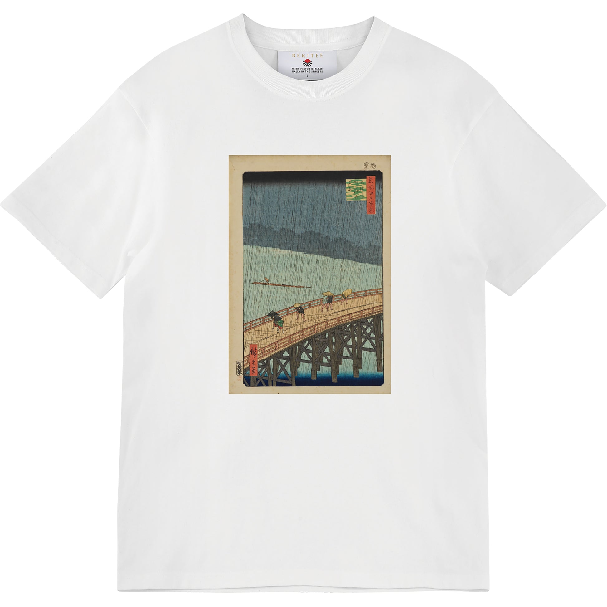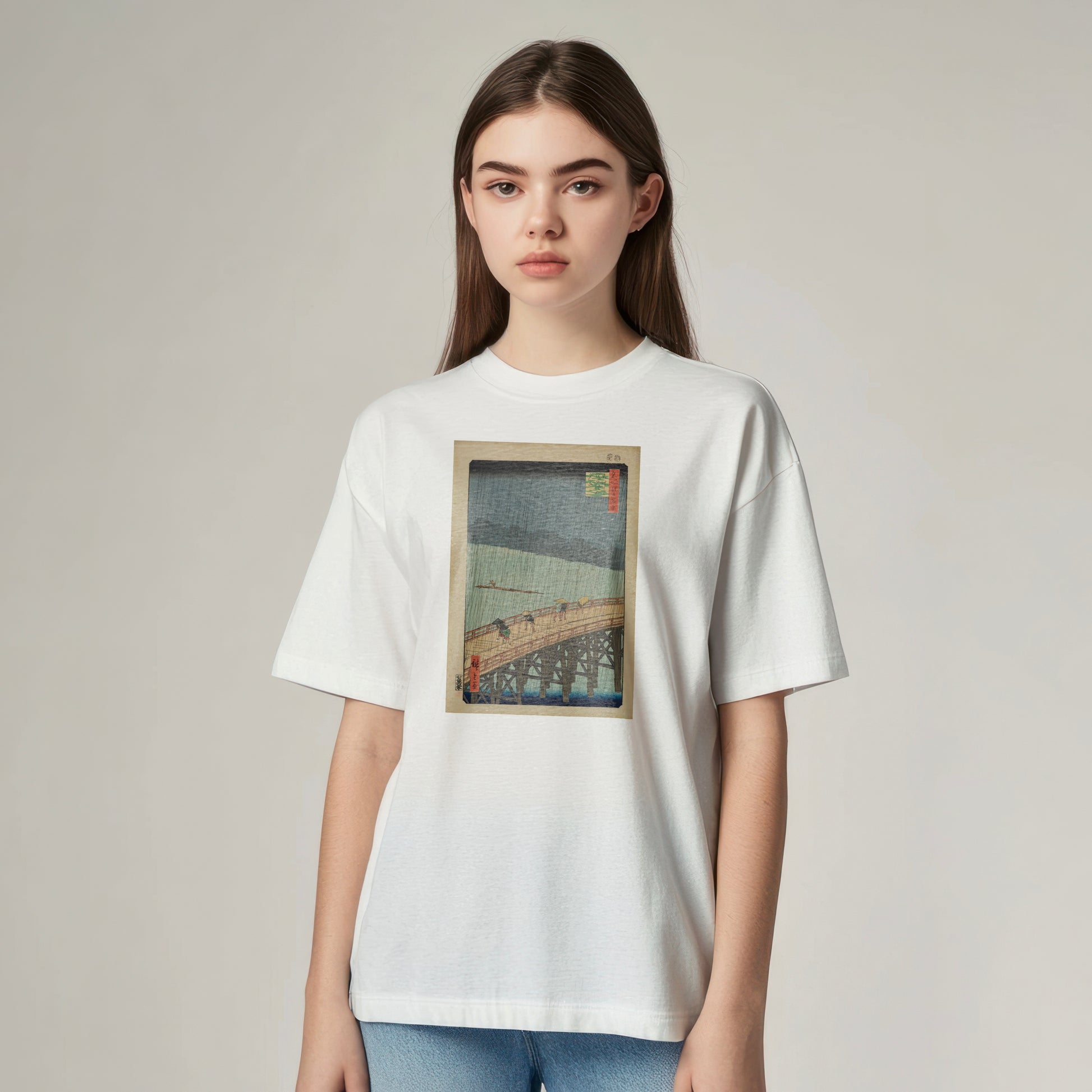 This work depicts the bridge over the Sumida River in the rain. The heavy rain and hazy distant scene from a bird's-eye view capture people hurrying across the bridge with umbrellas and rain gear, telling us that it is an evening shower. It is also famous that Vincent Van Gogh later copied it in oil painting.