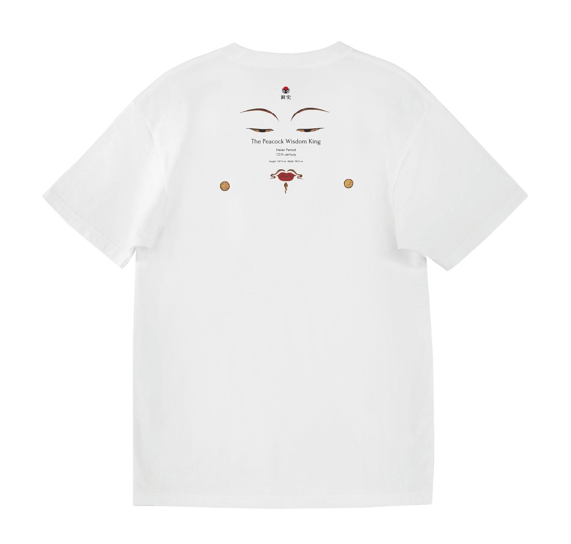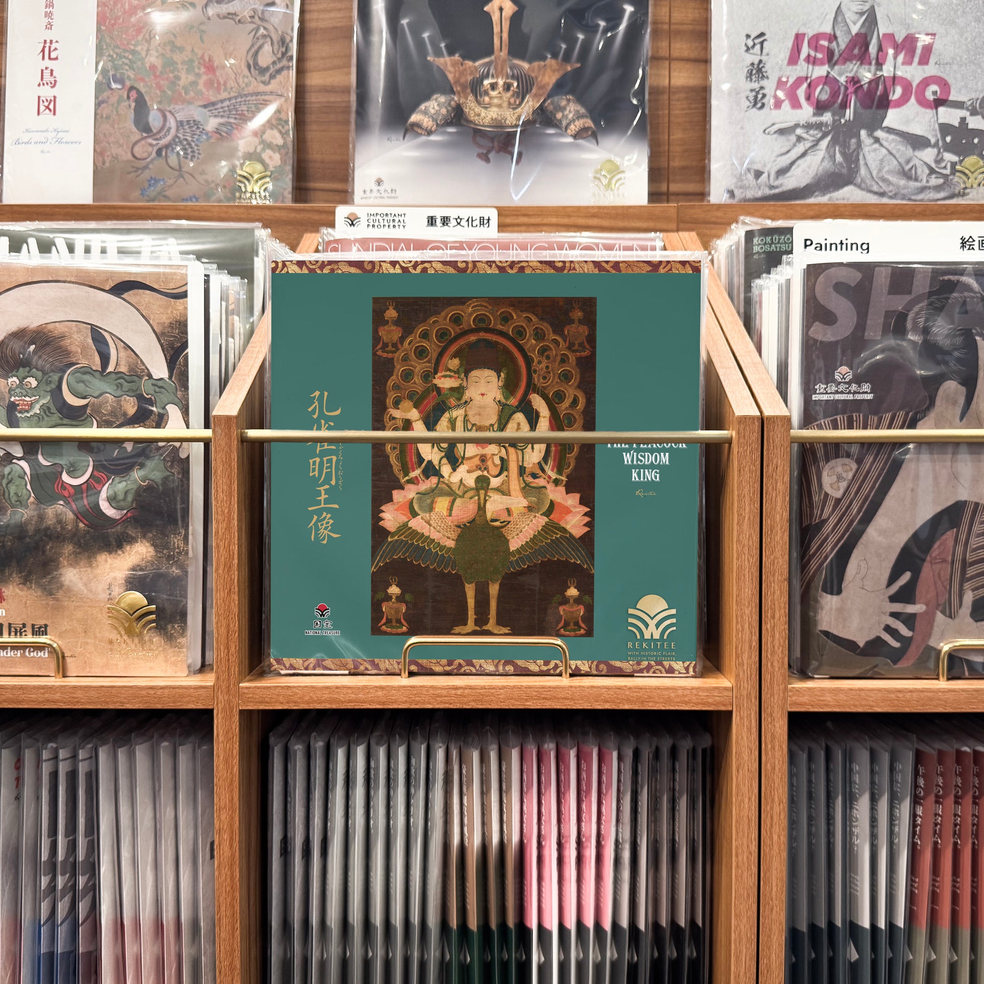 This 12th-century Buddhist painting of the Peacock Wisdom King is designated as a National Treasure. The Peacock Wisdom King is a deity in Esoteric Buddhism, believed to have the power to dispel suffering and misfortune, symbolized by the peacock's ability to eat poisonous snakes. The deity is depicted seated on a peacock with its wings spread wide, possessing four arms. In her hands, she holds a lotus flower, peacock feathers, and fruits associated with mythology.