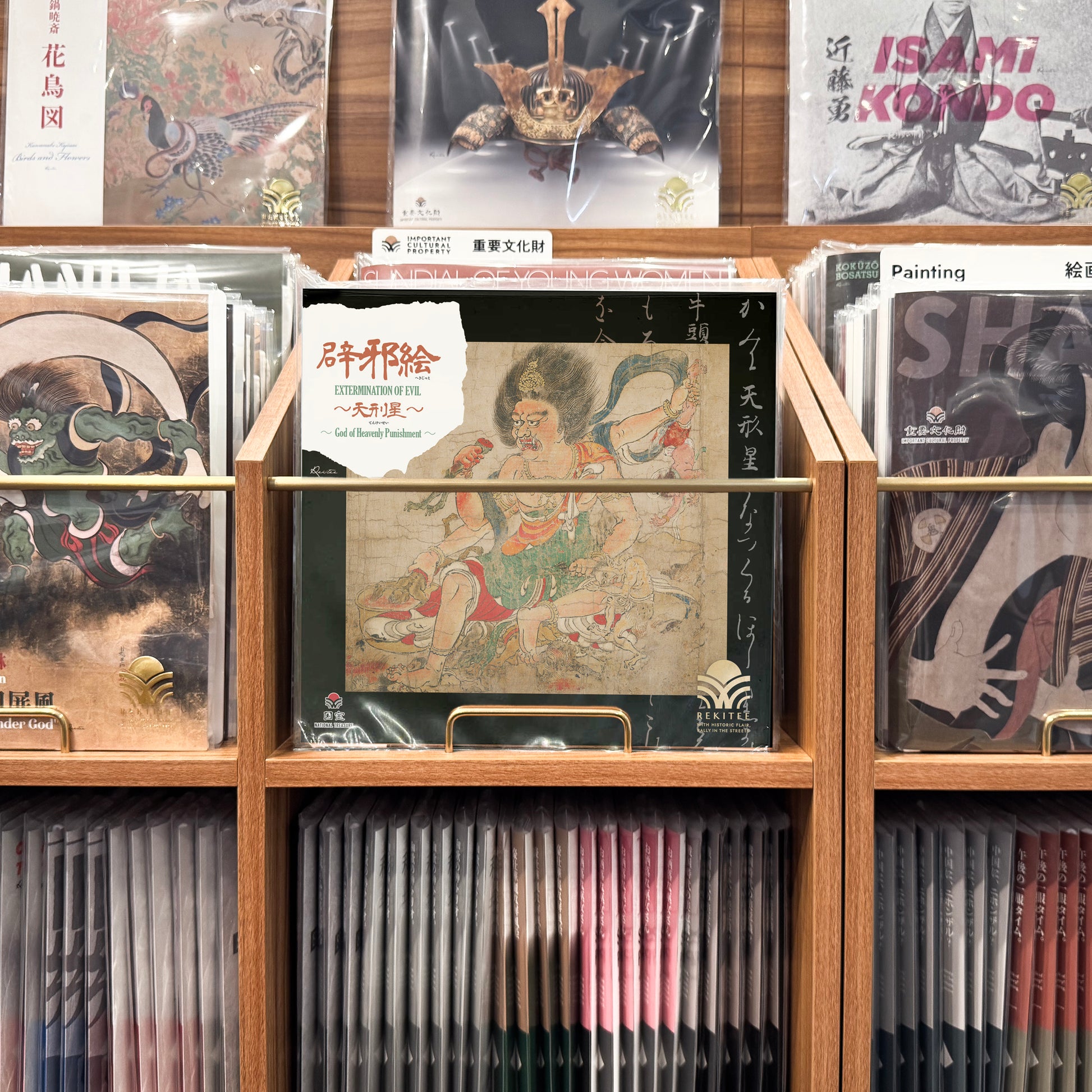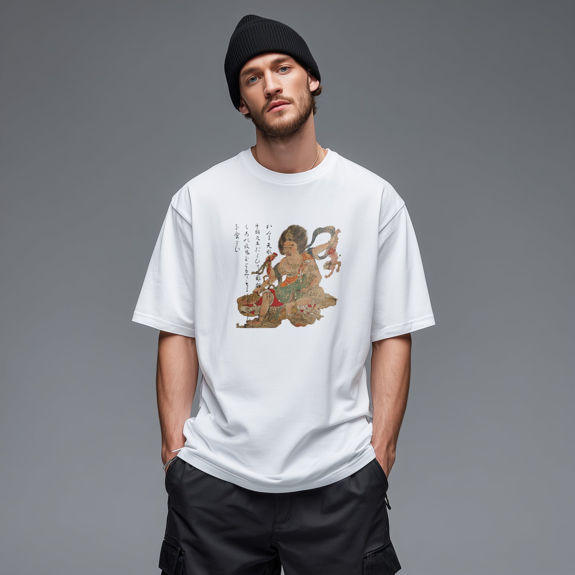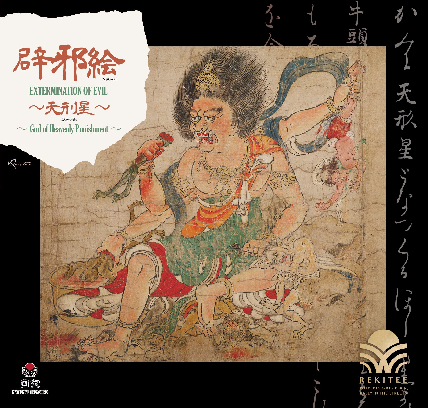 This artwork depicts Tenkeisei, who exterminates evil spirits that bring harm and illness. Originating in Taoism as a star god who administers heavenly punishment, Tenkeisei was later venerated in both Onmyōdō and Esoteric Buddhism. In this scene, he is shown eating plague demons soaked in vinegar. In his first right hand, he holds the half-eaten upper body of a demon, while his second left hand grips the ankles of Gozu Tennō, who is suspended upside down.